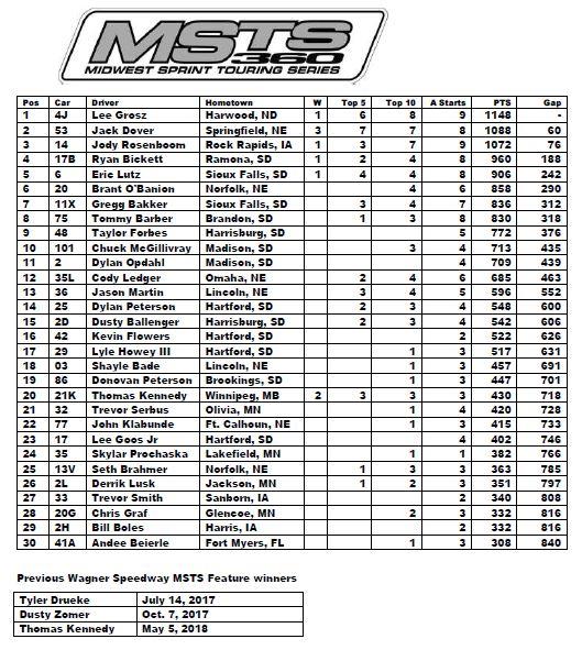 Here's a look at the stats for the Property Solutions of America Midwest Sprint Touring Series entering this weekend double-header at Wagner Speedway. The Fort Randall Casino Double Down Showdown features MSTS and Carpetland Nebraska 360 Sprint Series presented by Malvern Bank.
