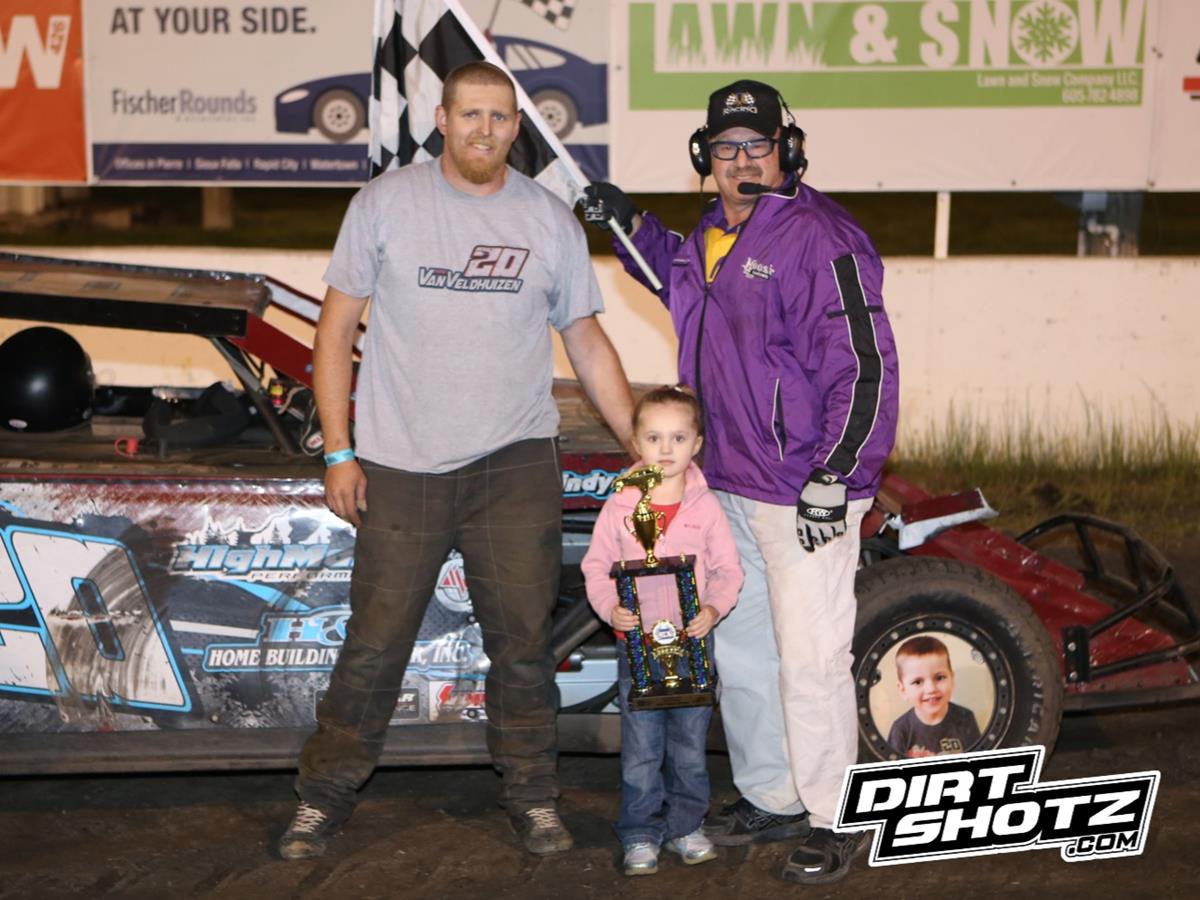 Derek VanVeldhuizen got redemption in the Great Western Bank USRA B-Modified feature. The previous week, the Rock Rapids, Iowa, driver flipped in turn four. On this night, he took the win – the first of his career at I-90 Speedway. Defending champion, Brock Hess, was second ahead of Camden Myers, Tyler Myers and Wade Wright.