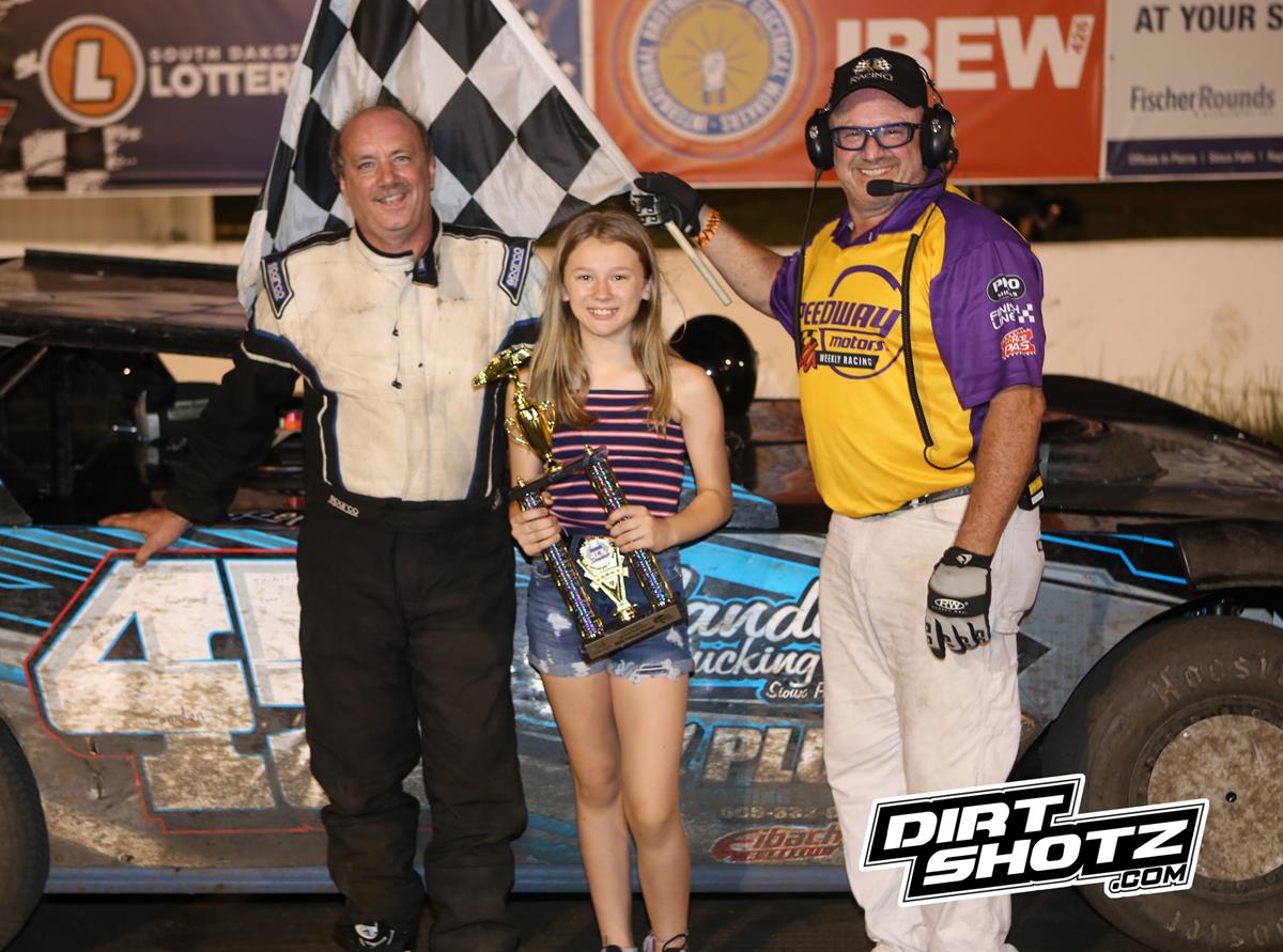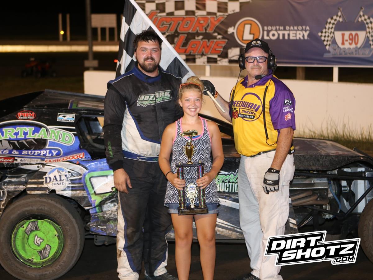 Tyler Myers made it to the winners circle for the third time at I-90 Speedway by taking the win in the Great Western Bank USRA B-Modifieds. Myers took the lead from John Kaiser just four laps into the feature. Kaiser took second ahead of Logan Kafka, Nick Barger – who was filling in for Skyelar DeVaney – and Tyler Tesch.