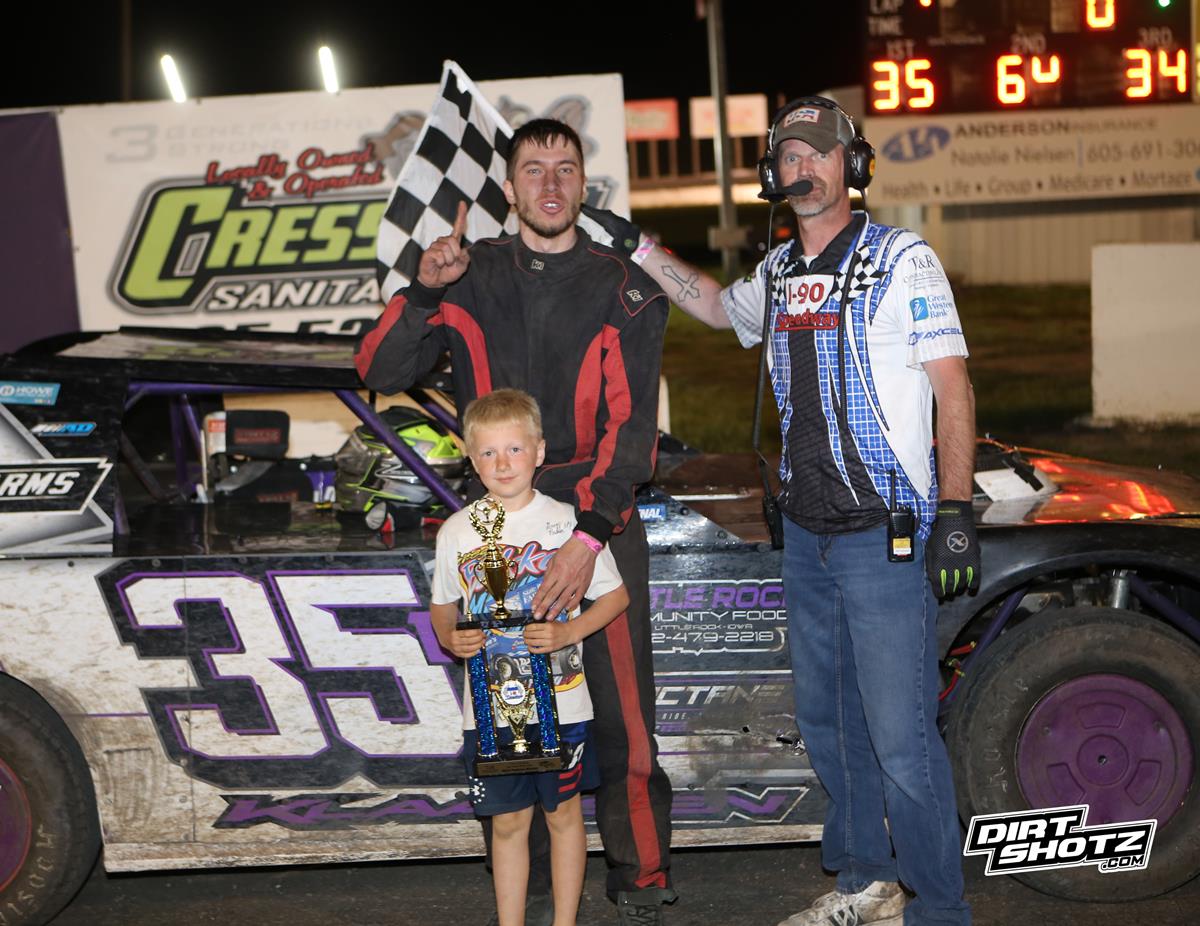 Miah Christensen made a bold move to take the lead of the USRA B-Modified feature just before the white flag. That paid off as he got the win. The first feature of the night went to Landon Krohn of Rowena, South Dakota. He was one of three different leaders in that exciting feature event.