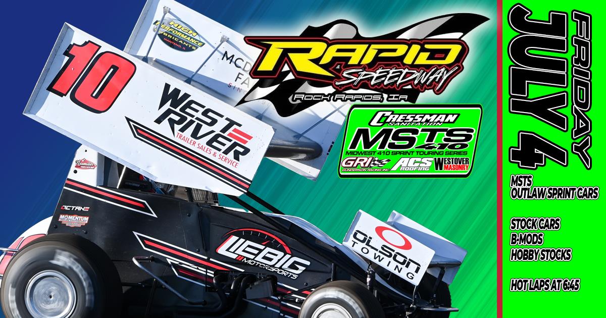 The July 4 event features the Cressman Sanitation Midwest Sprint Touring Series Outlaw Sprint Cars. Stock Cars, B-Mods and Hobby Stocks complete the racing card. The evening is capped off with a fireworks display.